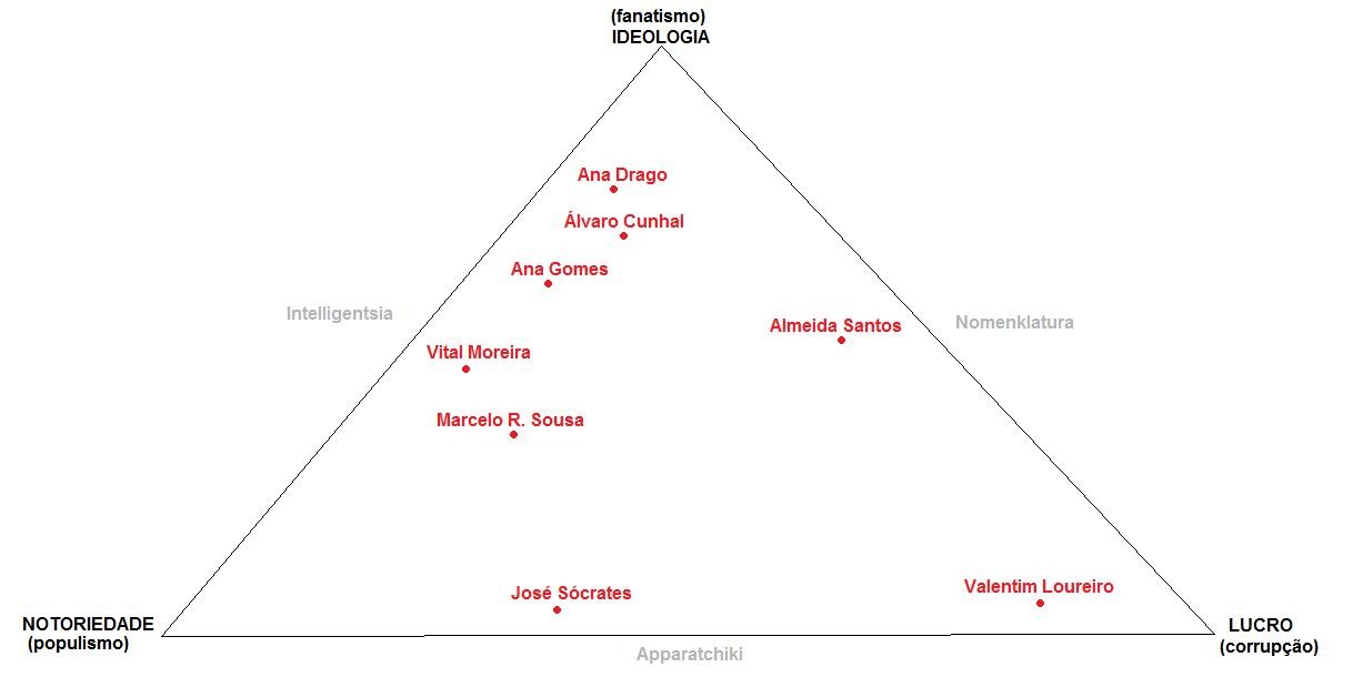 Concluindo podemos dizer que os políticos se posicionam sempre algures no espectro-trilema seguinte. Têm que se preocupar com a sua ideologia sem serem fanáticos, com notoriedade sem serem populistas, com lucro e sucesso pessoal sem se tornarem corruptos.