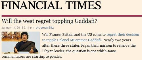 Nem um ano se passou desde a intervenção da NATO na Líbia (que Portugal apoiou...) e os aviões Europeus estão de volta aos céus africanos. Há umas semanas atrás, em vésperas de Natal, falava-se em Washington sobre a possibilidade de bombardear a Líbia de novo, desta vez para dar cabo dos Islamistas que o Ocidente havia armado durante a guerra civil Líbia. Para quem não esteve atento, os mesmos que assassinaram o embaixador Americano na Líbia e destruíram o consulado em Benghazi.